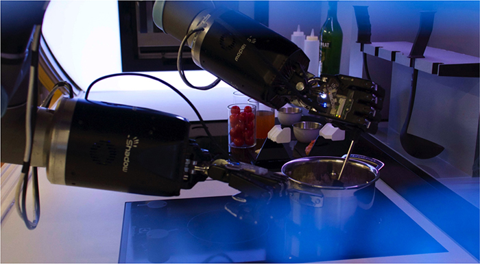 从外观上看,Moley Robotics 就像是一个配备着电磁炉、水槽、烤箱、各种厨具的小型厨房,除了那一对酷酷的机械手臂。别小看它,这对手臂可是和美国宇航局(NASA)的机器人师出同门,它不仅有着和人类手臂相似的外形,手指也十分精细。20 个电动马达、24 个关节、129 个传感器,让它具有和人类手臂一样的力度和速度,可以抓住各种锅碗瓢盆,切菜、倒食料、搅拌锅、装盘当然也都不在话下。
