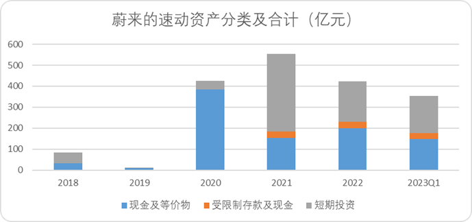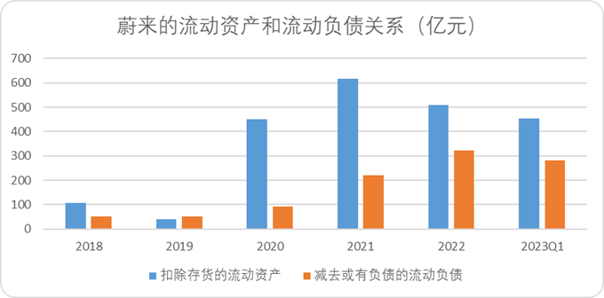 我们还是用2022年报数据作为参照系——毕竟2023Q1对于蔚来而言太惨了点:2022年度亏损144亿元,经计算的流动负债-流动负债的安全垫在190亿元左右。