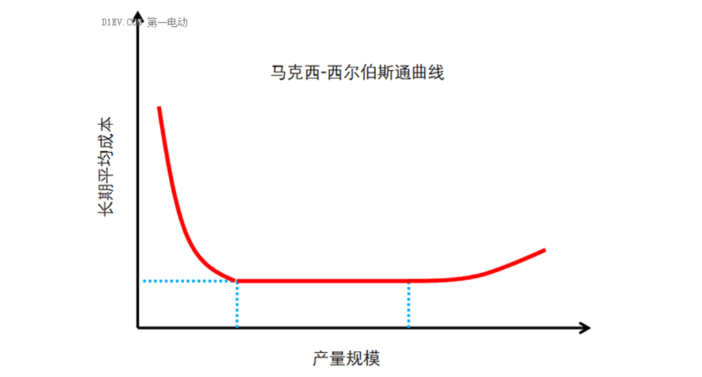 根据马克西—西尔伯斯通曲线,汽车单一车型年产量爬坡过程中,开始平均成本大幅度下降,随后下降幅度放缓,接着将达到最小有效规模MES临界点,此后在较大范围产量规模之内,长期平均成本达到最低并维持稳定,此阶段内产量进一步提升不会影响长期平均成本。