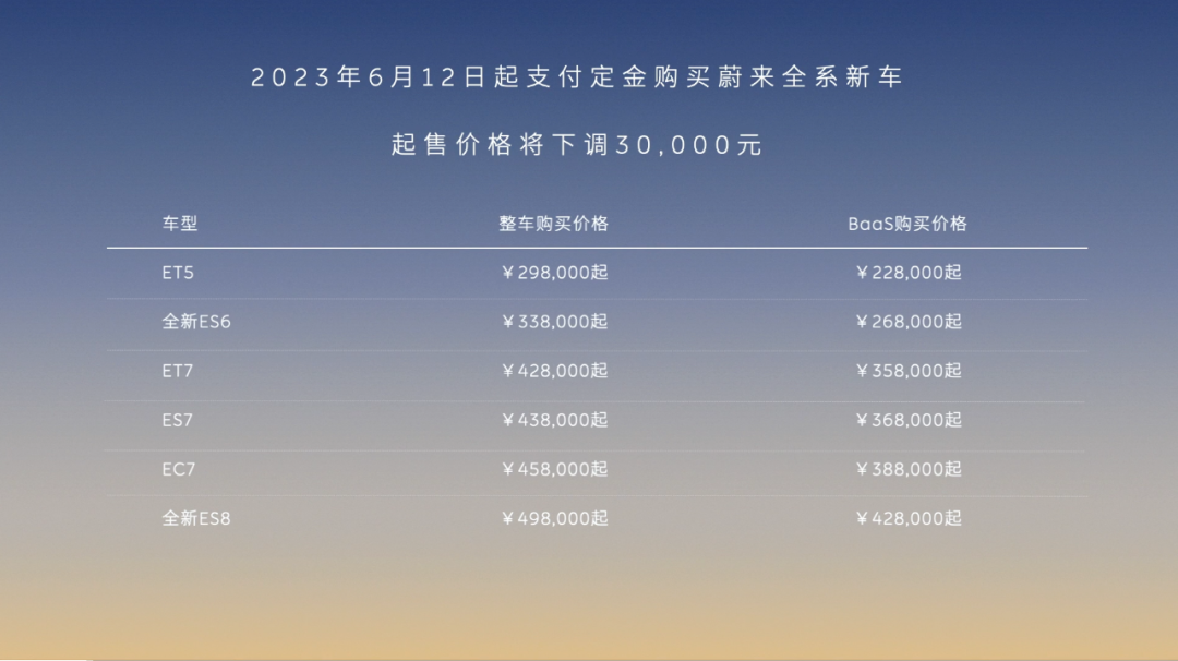 6月12日,蔚来宣布全系车型起售价降低3万元,同时对换电权益进行调整。