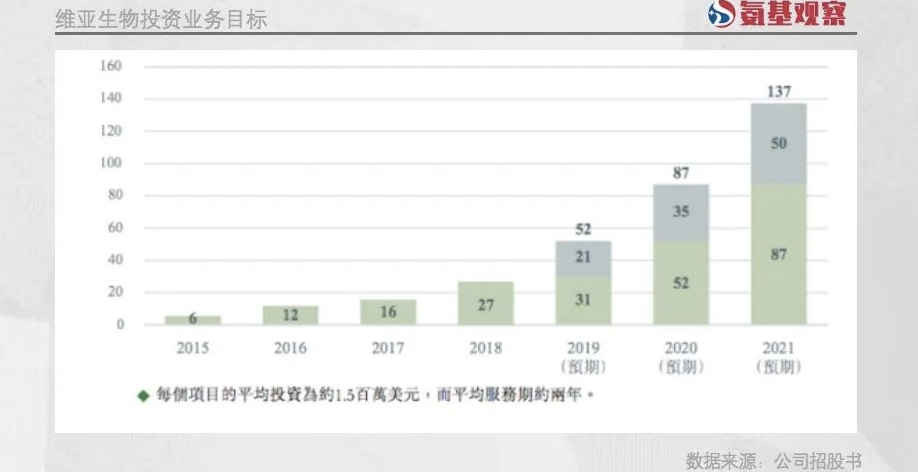 2015年开始,维亚生物孵化项目数量逐年增长,到2018年开始累积达27个。根据公司设想,到2021年末将达到137个。
