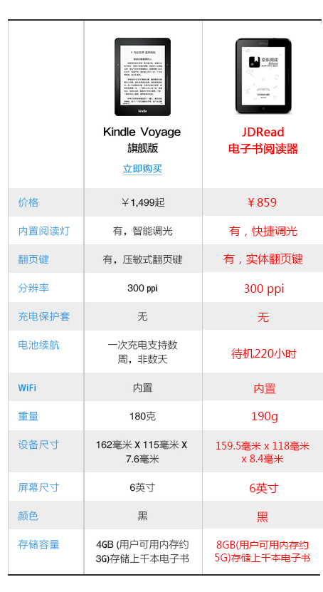 在祭出对比照前,我们先来看个参数表。本着公正客观的原则,Voyage的参数截图来自亚马逊官方销售页面,我在右边增加了JDRead的参数。