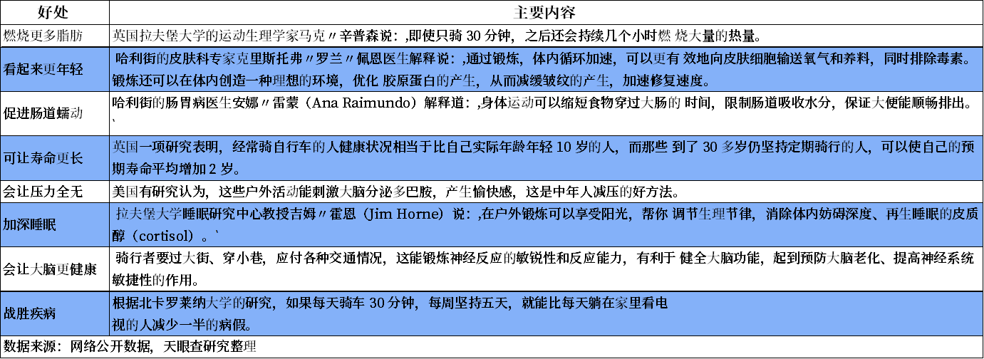 随着生活、消费水平的提高,人民的健康意识在快速提升,开始广泛的参与各种体育活动。收入水平的提升使得更多人能够满足自行车骑行装备上的花费,因而骑行运动快速兴起。运动学专家认为骑自行车具有能预防大脑老化、提升心肺功能、减肥、改善性功能等多项健身作用。骑在车上,你会感觉十分自由且畅快无比。它不再只是一种代步工具,更是愉悦心灵的方式。