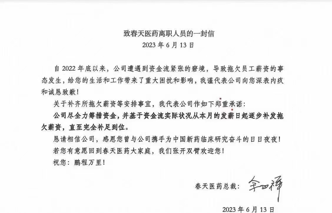 春天医药的欠薪传闻则是有内部信件流出。春天医药总裁余四祥在内部信中袒露,公司遭遇资金流紧张的窘境,导致拖欠员工薪资的事态发生。公司将尽力筹措资金,并基于资金流实际情况从本月的发薪日起逐步补发拖欠薪资,直至完全补足到位。