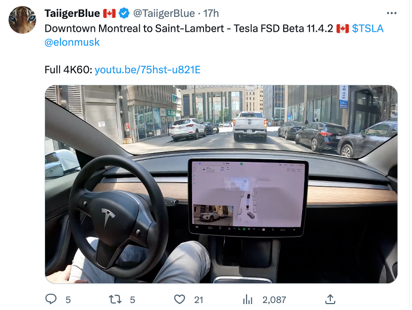 加拿大蒙特利尔市中心,一辆流线型的特斯拉在车流中穿梭。车内方向盘自动转向,驾驶员要做的事只有两个:看着前方,偶尔碰下方向盘。