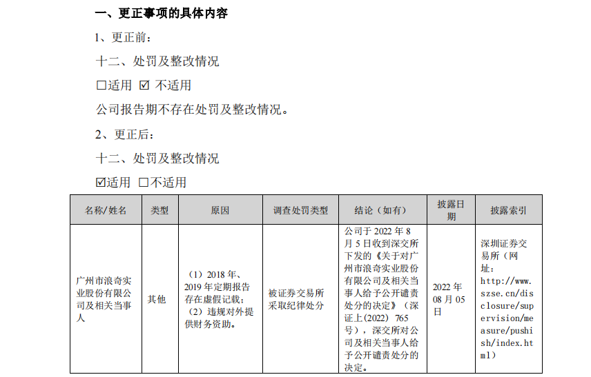 但是,广州浪奇在今年3月发布的2022年年度报告中,却并没披露这一信息,因此,昨日该公司发布了2022年年报的更正公告,将这一违规信息如实披露。