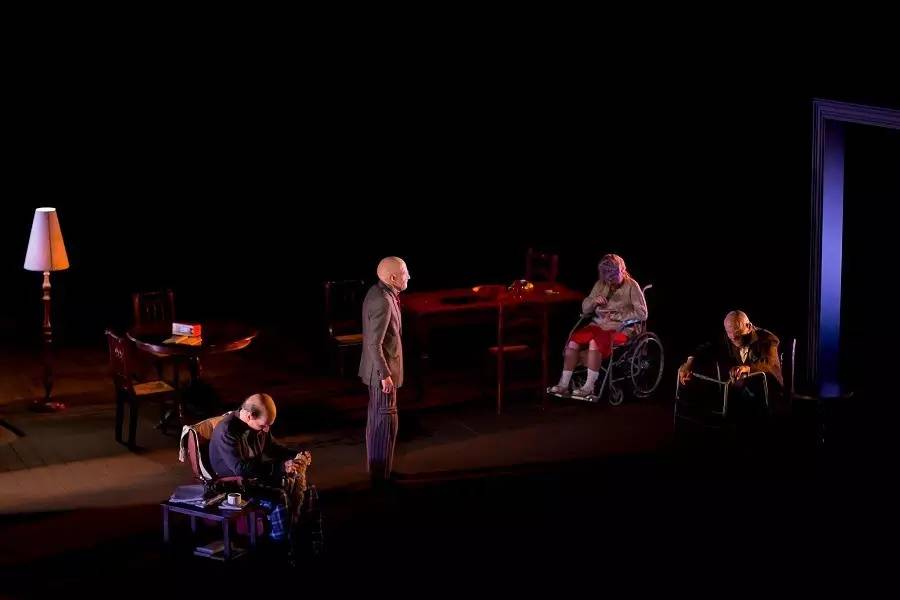 阴森的舞台上左右各有一道门,冷光照亮三名护理人员,他们手拿人皮面具,在上面绘制皱纹与老年斑。命运三女神能剪短人间的生命之线,而这三位护工能剥夺人的生命活力。