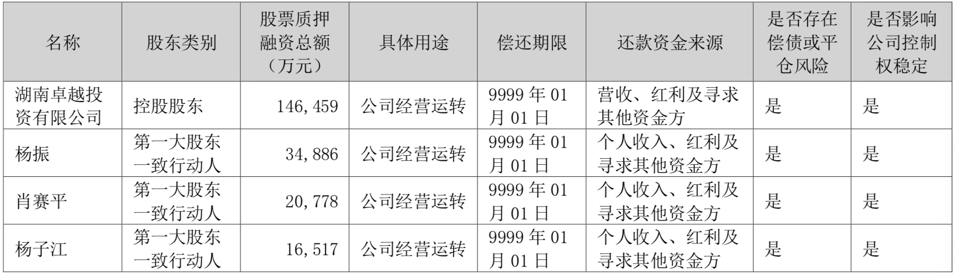 其中,卓越投资共计质押、冻结2.16亿股,占其所持股份的99.78%,占总股本的18.75%。杨振所持1.18亿股几乎全部质押、冻结,杨子江所持8244万股全部质押、冻结,肖赛平所持7056万股全部质押、冻结。年报显示,四位一致行动人质押用途均为公司经营运转,质押存在偿债和平仓风险。