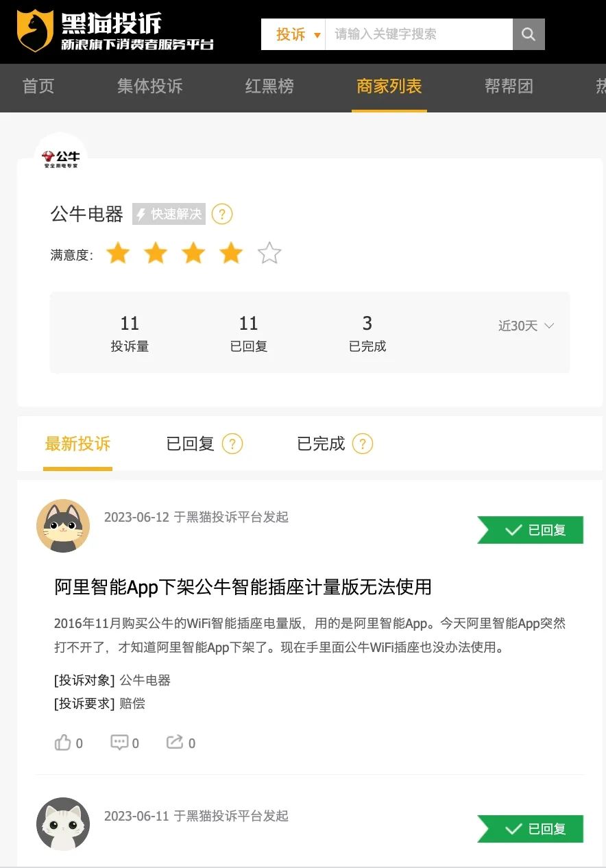 而且,公牛对于消费者们的投诉似乎不够重视。子弹财经在黑猫投诉平台上发现,近30天关于公牛的投诉达11起,完成率仅为27.27%。