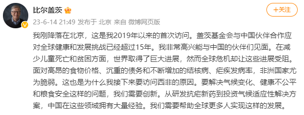 北京时间6月14日晚,微软创始人比尔·盖茨在微博和推特发文称已抵达北京,这是他自2019年以来的首次访问。他说,盖茨基金会与中国伙伴合作应对全球健康和发展挑战已经超过15年,很高兴能与中国的伙伴们见面。