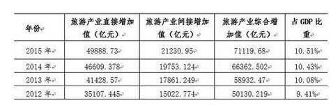 国家旅游局今年上半年曾发布《中国旅游发展报告(2016)》指出,旅游业对GDP的综合贡献,从2012年的9.41%上升为2015的10.51%,已经超过了教育、银行、汽车产业。其中,2015年旅游业的直接增加值是4.99万亿元,国内旅游人数40亿人次,国内旅游收入3.42万亿元。