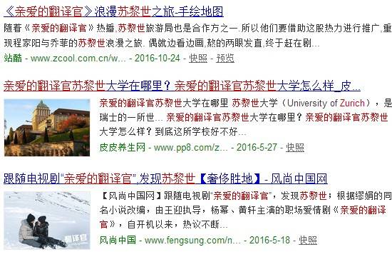 《亲爱的翻译官》中,杨幂和黄轩扮演的角色,在苏黎世大学初见,之后就展开了一连串虐狗又狗血的苏黎世浪漫之旅——像什么喝Napfgasse喷泉的水啦,在伊甸湖畔酒店吃芝士火锅啦,大结局时的苏黎世湖区啦……