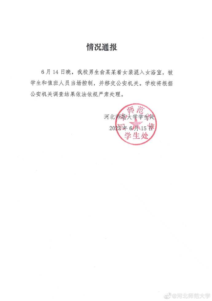 6月15日凌晨,河北师范大学发布情况通报称,6月14日晚,我校男生俞某某着女装混入女浴室,被学生和值班人员当场控制,并移交公安机关。学校将根据公安机关调查结果依法依规严肃处理。