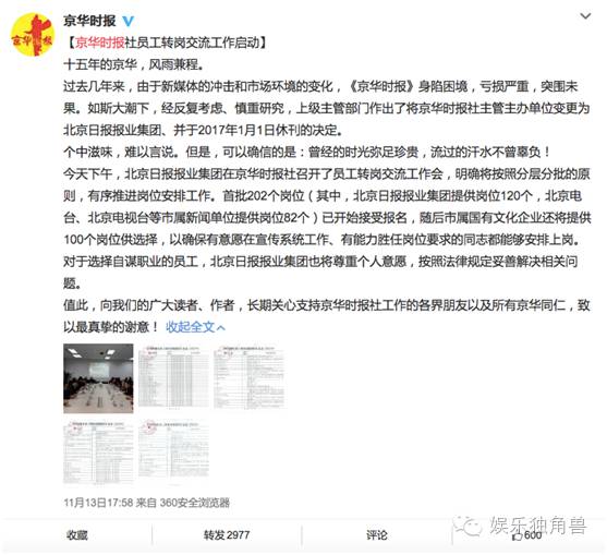 11月13日傍晚,京华时报官方微博发布消息称,由于“新媒体的冲击和市场环境的变化,《京华时报》身陷困境,亏损严重,突围未果”,“上级主管部门作出了将京华时报社主管主办单位变更为北京日报报业集团,并于2017年1月1日休刊的决定”。