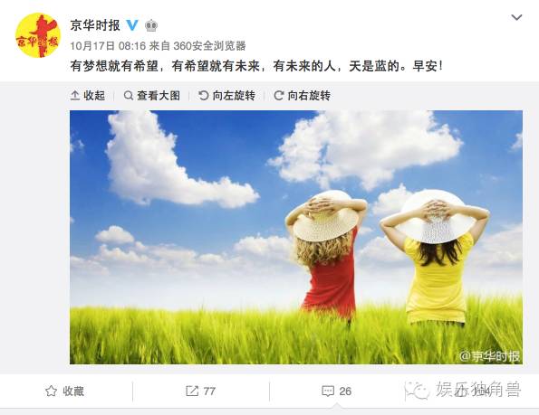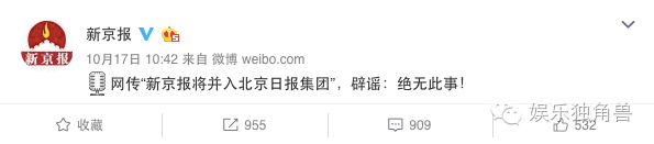 连前几天刚刚过了13岁生日的《新京报》,也在《京华时报》休刊事件中“躺了枪”。10月17日凌晨,一则“京华时报停刊!人员并入北京晨报,新京报则划入北京日报集团”的消息在网络上炸开了锅。当时《京华时报》只发了一条模棱两可的微博:“有梦想就有希望,有希望就有未来,有未来的人,天是蓝的。”《新京报》则果断辟谣:“绝无此事!”然而此事还是引发了不小的惶惑。