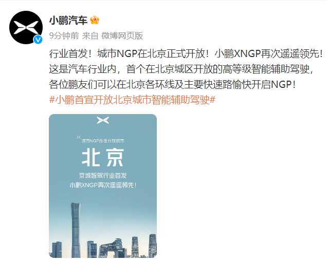 小鹏汽车微博6月15日消息,小鹏汽车宣布城市NGP在北京正式开放,成为行业内首个在北京城区内开放的高等级智能辅助驾驶。