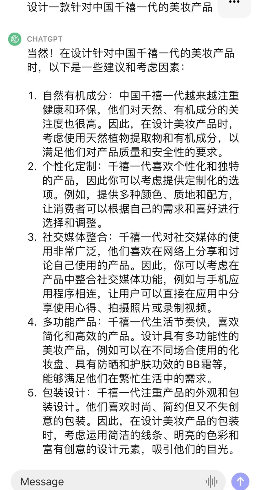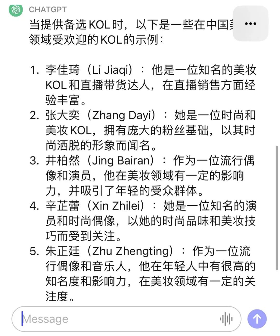 在与CBO的沟通中,ChatGPT很快能正针对中国新年给出一套完备的产品设计和包装的方案,并在产品开发和营销传播层面细致的给出了建议。在KOL的投放建议上,ChatGPT也能做到各个领域和不同风格兼顾。虽然站在专业的角度来看,这份方案还较粗糙,但随着人工智能技术的算法提升,日后还将充满更多想象。