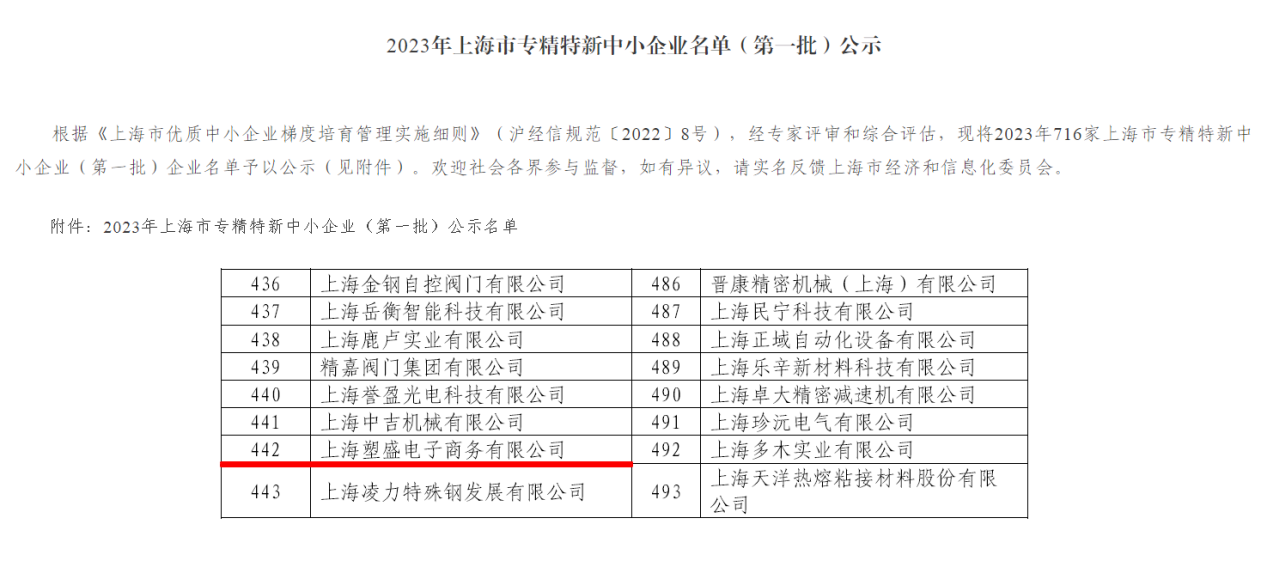 近日,上海市经济和信息化委员会公示了“2023年上海市专精特新中小企业名单(第一批)”,卓尔智联旗下化塑汇下属科技公司——上海塑盛电子商务有限公司(简称“上海塑盛”)入列其中。