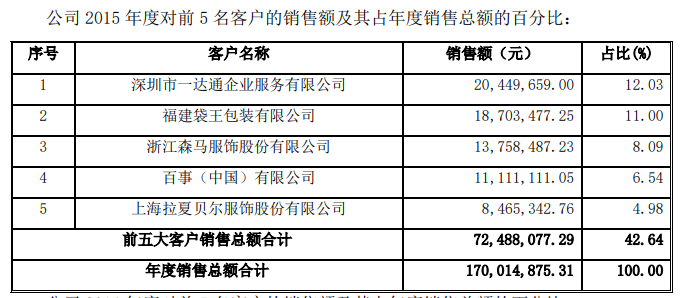 南王科技新三版公开转让说明书显示,2016年前,其主要客户以服装行业为主,彼时阿里旗下的跨境电商平台一达通、绫致、以纯、森马和拉夏贝尔都位列过南王科技的前五大客户。