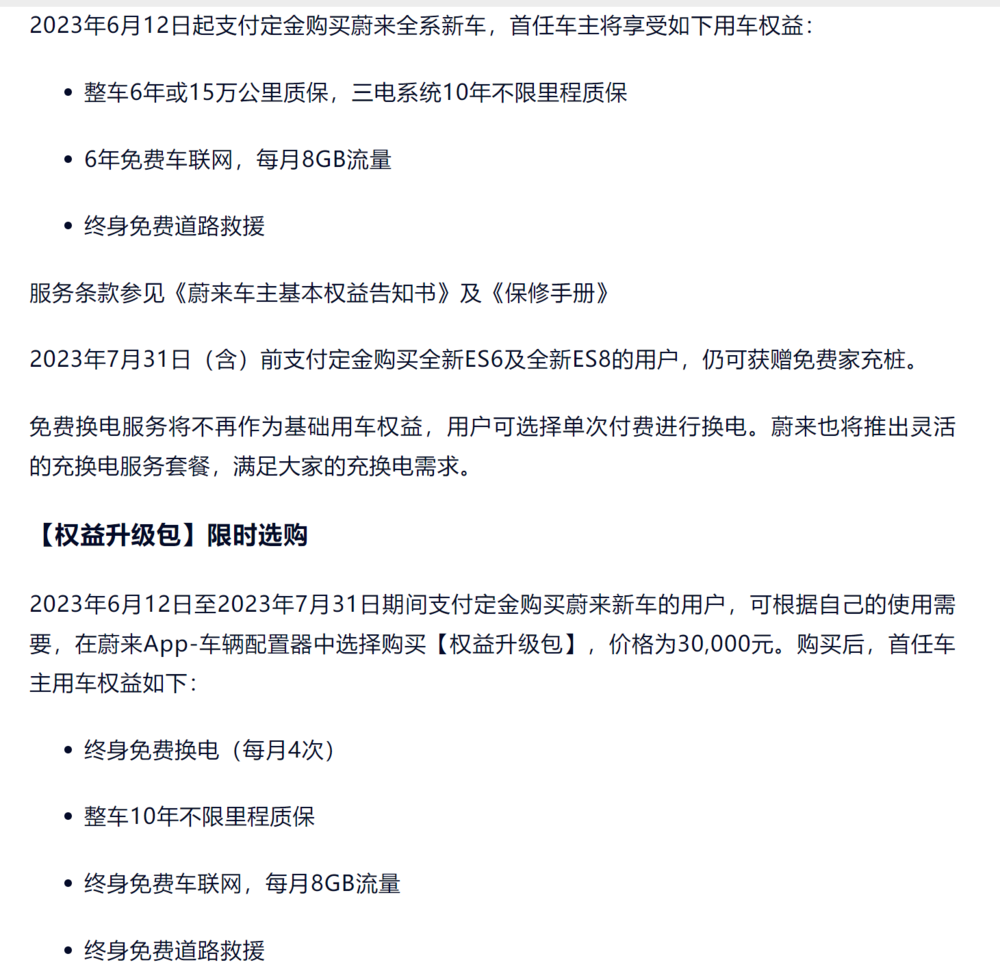 很多地方,换电站不像江浙沪一样普及,很多人想买蔚来的车,不得不捆绑免费换电权益,对消费者来说,与其要用不上的权益,还不如实打实的便宜。之前在4月9日,蔚来就宣布从6月1日起,将四款车型的家用充电桩由免费赠送改为付费购买,并且将每月6次免费换电(不保留家充桩)下调至每月4次,但并没有涉及价格。