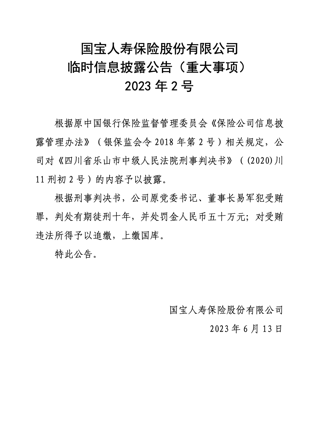6月15日消息,国宝人寿保险股份有限公司近日发布公告称,根据《四川省乐山市中级人民法院刑事判决书》,该公司原党委书记、董事长易军犯受贿罪,判处有期徒刑十年,并处罚金人民币五十万元;对受贿违法所得予以追缴,上缴国库。
