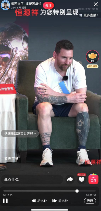 6月14日下午2时许,“梅西来了-遥望阿卓馆”提前进行直播,开播1小时后,梅西以一身运动装扮亮相直播间,停留了约15分钟。这也是梅西本次中国行,第一次真人现场在直播间与球迷粉丝互动。