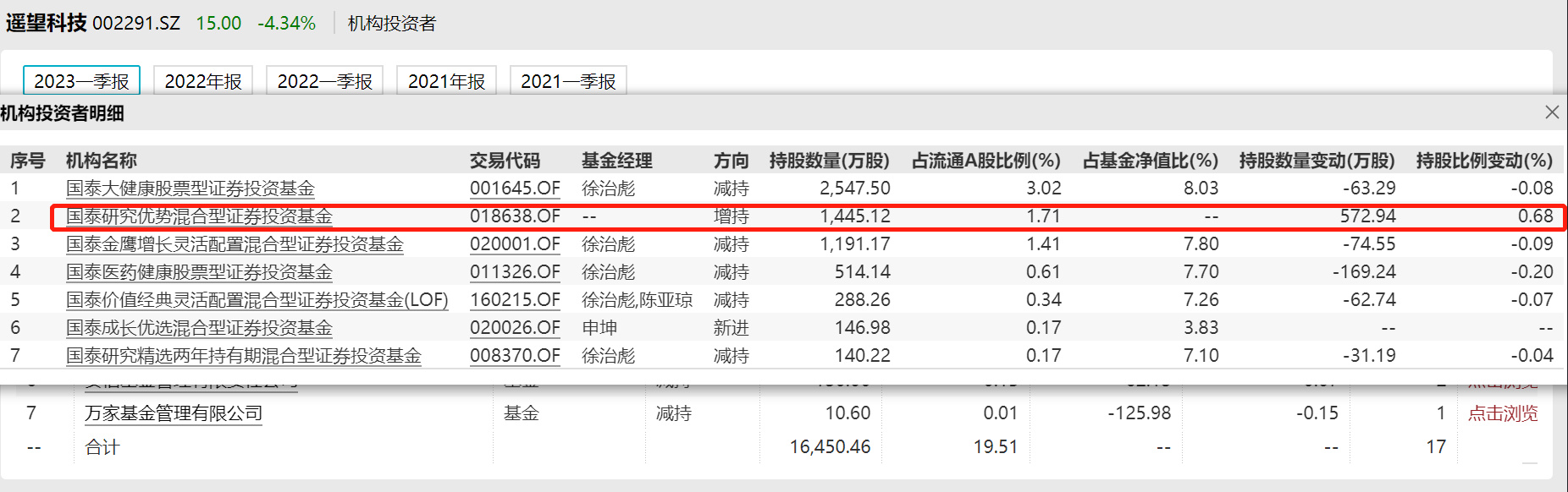 国泰大健康的季报显示,遥望科技已经连续十个季度位列重仓股。2020年四季度,星期六(后更名为遥望科技)首次出现在国泰大健康的重仓股中,持股777.05万股,位列第十位。而到了2022年二季度,遥望科技甚至成为了第一重仓股,持股数量达到了1689.13万股。