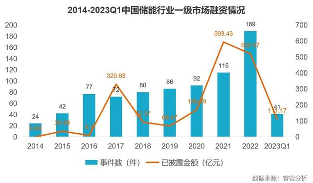在投融资上,储能行业也成为一级市场投资新热点,其热度持续高涨,尤其是2022年,储能融资处于爆发期。据睿兽分析统计,2022年,我国储能行业融资事件189件,同比增长64.3%,融资金额520.97亿元,也处于高位。