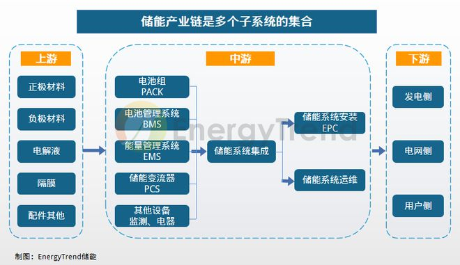 具体来看,锂电池储能产业链一般有三个环节,从上游设备商、中游系统集成商再到下游应用端。储能项目的建设流程一般是应用端对储能项目进行招标,系统集成商去竞标,电池企业再向集成商提供储能电池。