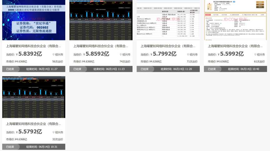 6月14日,世纪华通发布了公司股份法拍进展,股东上海曜瞿如网络科技合伙企业(有限合伙)被摆上货架的4亿股股权全部成交,由国华人寿、浙商证券、贪玩信息、嘉兴旭恺和自然人王杰各拿下8000万股股份,持股比均为1.07%。