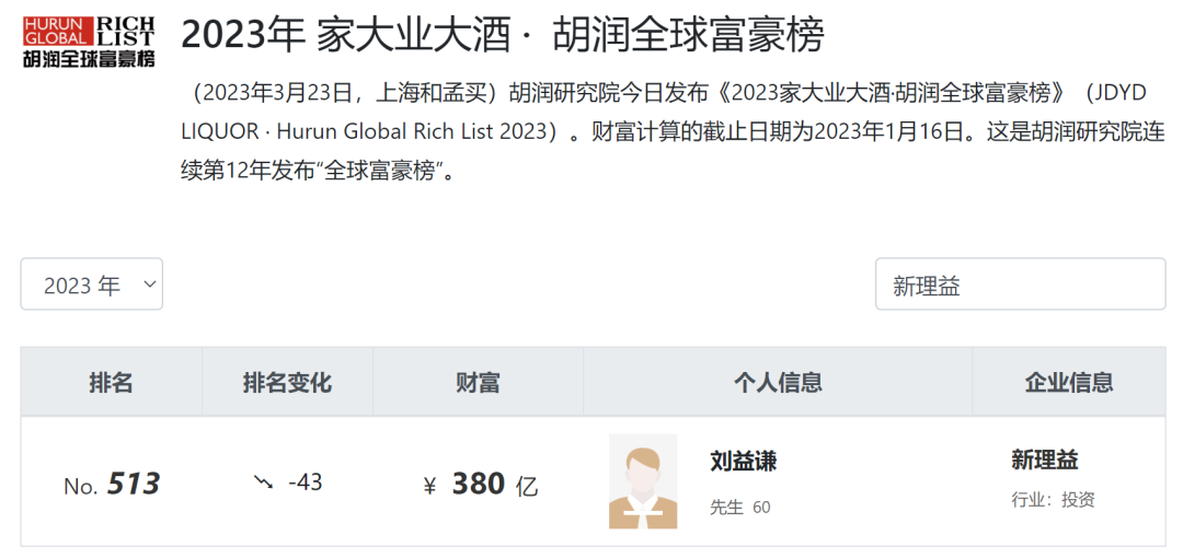刘益谦的广撒网布局很快就迎来了收获。2005年,股权分置改革通过后,法人股流动性好转,股价大涨,刘益谦的身家也水涨船高。次年,刘益谦就以12亿元的身家迈入胡润百富榜。如今,刘益谦家族的财富已经积累到380亿元,并在2023胡润全球富豪榜中位列第513位。