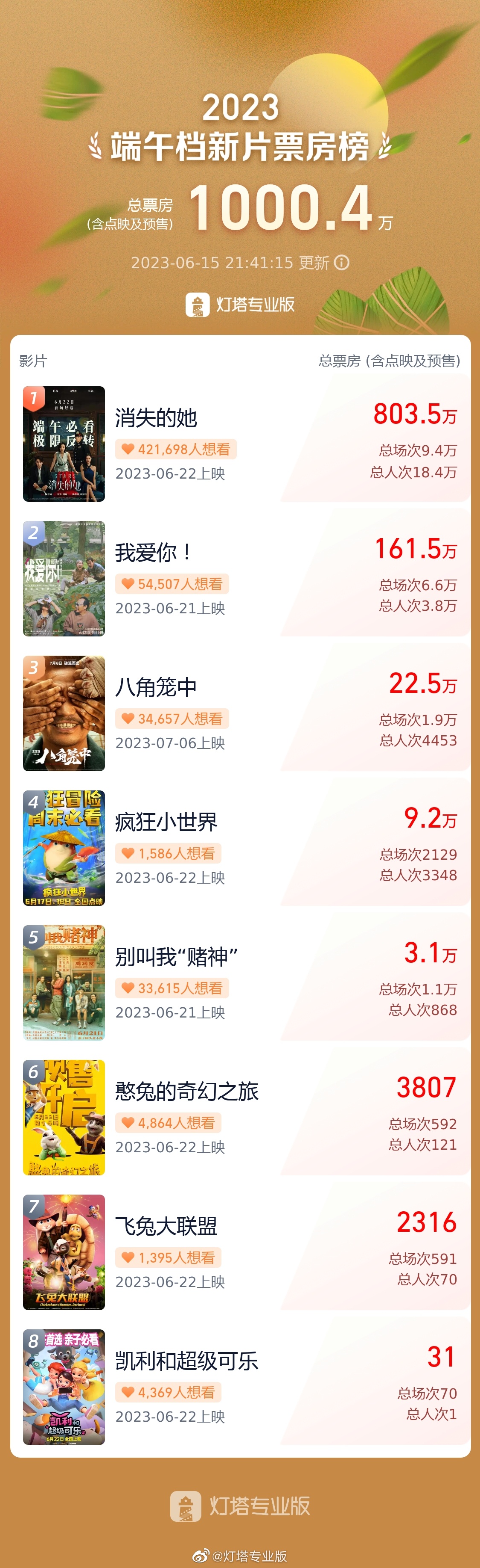 据灯塔专业版实时数据,截至6月15日21时41分,2023年端午档新片预售总票房突破1000万(含点映),《消失的她》以803.5万领跑预售票房榜。