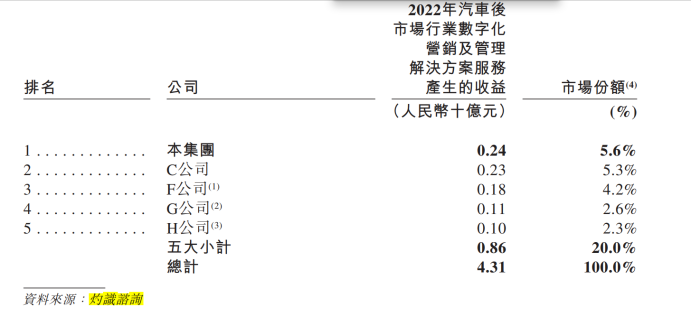 在招股书中,广联科技宣称,按照2022年收入计,自己在中国汽车后市场行业的“数字化营销及管理服务行业中排名第一”、“智能网联服务市场中排名第二”、“数字化链接服务行业中排名第三”。