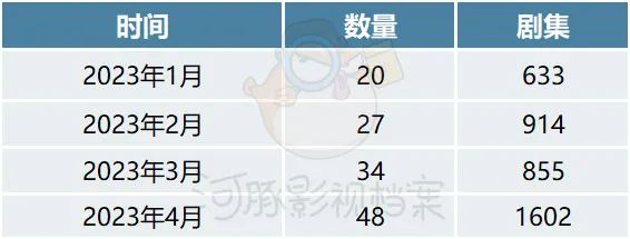 2023年3月,全国电视剧拍摄制作备案公示的剧目共34部、855集。2023年4月,全国电视剧拍摄制作备案公示的剧目共48部、1602集。