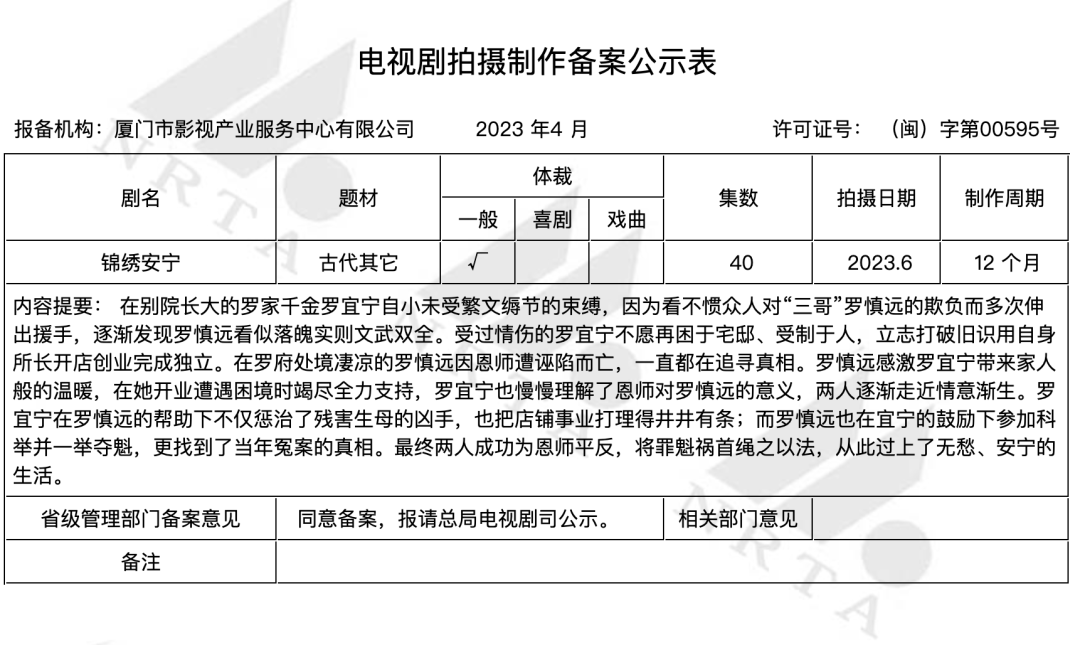 华策影视出品的古装传奇剧《锦绣安宁》(又名《长街长》)改编自晋江人气作者闻檀的S+级作品《首辅养成手册》,原小说被称为集权谋+养成+甜宠于一体的古言经典大作。该剧由麦贯之执导,任敏、张晚意、高卿尘主演,近日已开机。