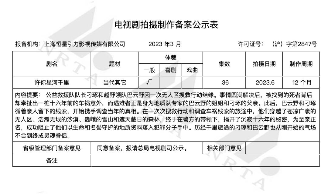 《许你星河千里》由恒星引力备案,改编自桃桃一轮的同名小说。恒星引力制作并发行了《怪你过分美丽》《谢谢你医生》《苍兰诀》等大热剧。