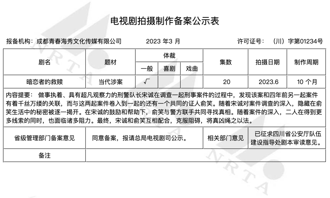 悬疑剧《暗恋者的救赎》由优酷、海映传媒联合出品,改编自樊树创作的同名小说,原著被称为无法剧透的“多重心理反转”悬疑小说。该剧将由知名导演林育贤(代表作《翻滚吧!阿信》)执导,黄宗泽、王珞丹主演,由曹雪萍(代表作《紧急公关》)担任编剧,并将于今年6月在成都开机。