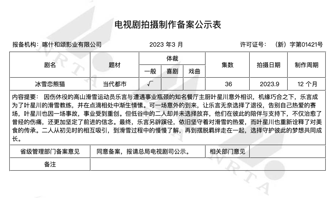 改编自唐家三少同名小说的都市甜宠剧《冰雪恋熊猫》,由李冰冰的和颂影业备案,讲述了知名厨神与滑雪运动员的救赎与守护的甜宠故事。两人守护彼此梦想共同成长的同时,也摆脱羁绊走到了一起。同样为青春竞技题材的还有去年的《炽道》。该剧预计9月份投入拍摄,集数为36集,制作周期为12个月。