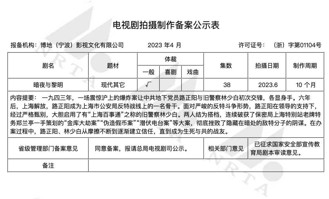 谍战剧《暗夜与黎明》早在去年年底就在2023年总台电视剧片单——“匠心原创·铸就经典”版块亮相,是央视重点作品。该剧由金琛、黄楠执导,翁良平编剧,陈哲远、聂远、邢菲、姚安娜、王志文、倪大红、孙岩等主演。出品方天浩盛世曾出品《我才不要和你做朋友呢》《女士的法则》《海边升起一座悬崖》等作品。