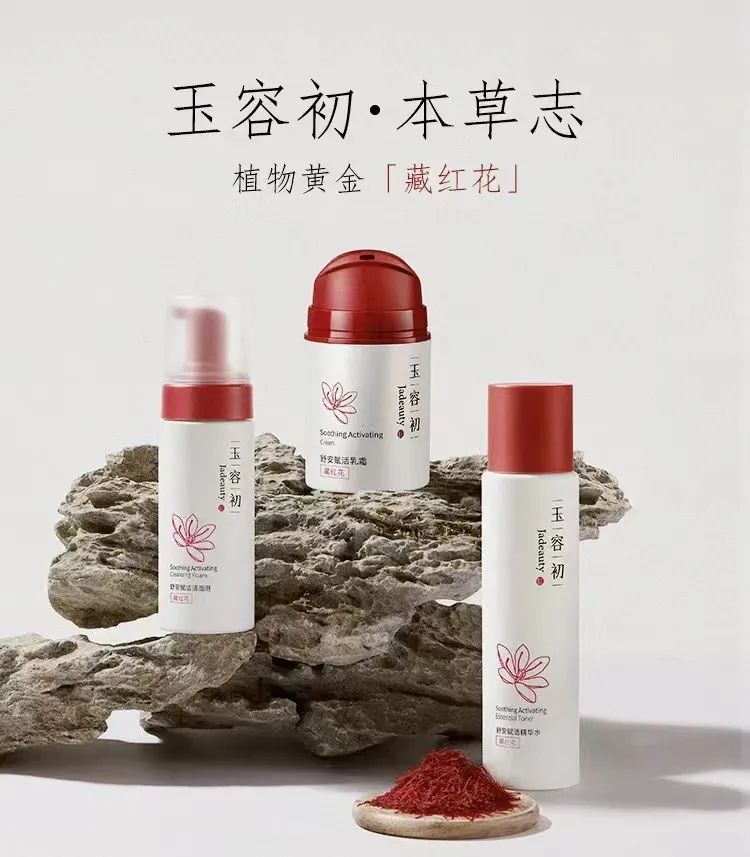 融资之外,还有企业自创品牌进入中草药美妆赛道。2021年,丽人丽妆就曾以东方美学中草药为定位,创立玉容初,旗下产品涉及乳液、精华、面膜等,以号称“植物黄金”的药材“藏红花”作为差异化核心成分。在配方上,选择创新性的“同向组配”复方理念,在藏红花基础上使用积雪草、牡丹根皮等多种同向药材,形成强效矩阵。