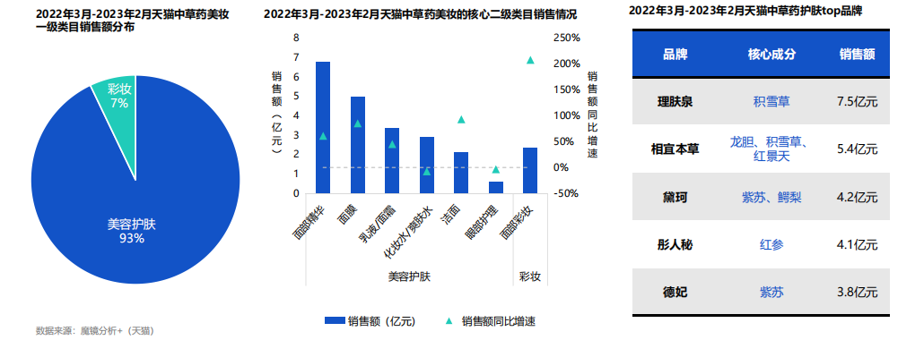 天猫美妆数据显示,美容护肤在中草药成分产品中占比93%,销售额超31亿元。分二级类目来看,面部精华、面膜、面霜等品类对于中草药应用较为成熟,且同比增长较快;增长最快的品类为洁面和面部彩妆,增速均在100%+。
