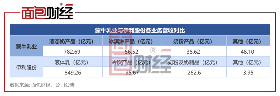 通过数据对比可以观察到,乳业双巨头的液态奶业务增速都略有放缓,但市场格局稳定。