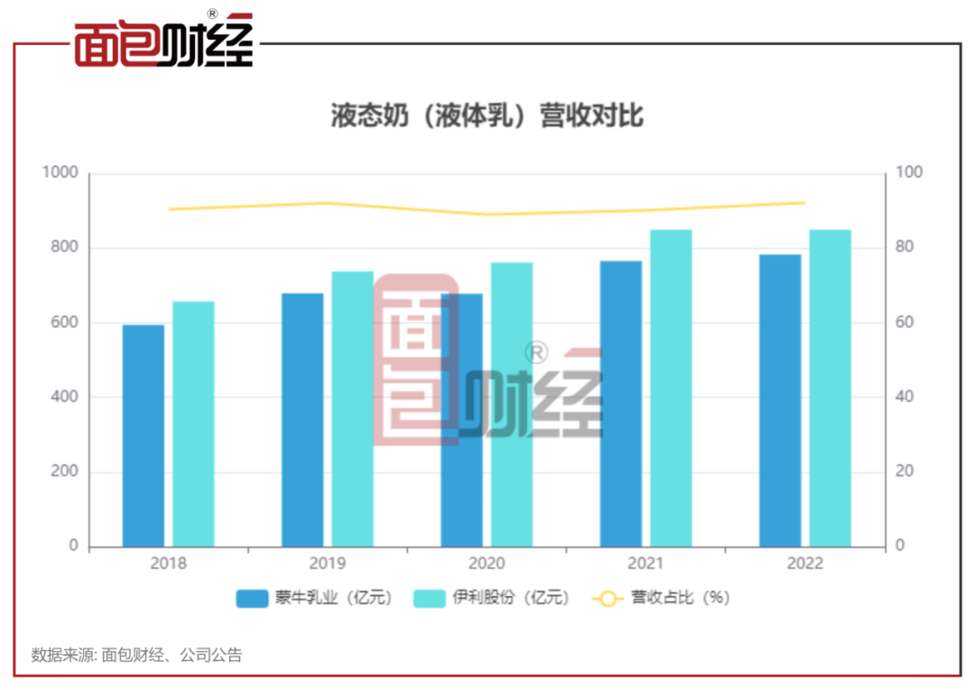 近年来,蒙牛乳业液态奶业务的营收与伊利股份液体乳业务营收的比例保持平稳,均在90%左右。2022年,这一比例有所上升,达到约92.16%。