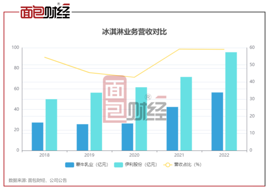 相较于伊利股份的冷饮业务,蒙牛乳业冰淇淋业务的营收对比在最近两年有所攀升。由2020年不足45%上升至2021年和2022年接近60%。这在一定程度上显示出蒙牛在这一细分市场上份额有所提升。