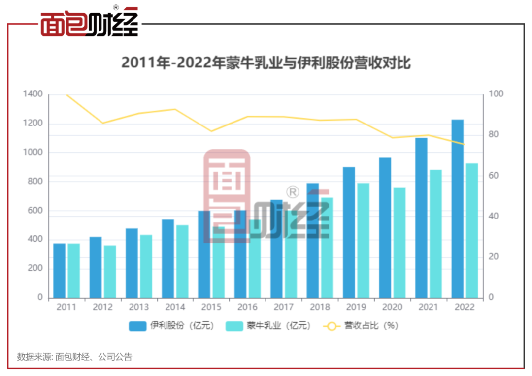 然而,11年之后的2022年,蒙牛乳业营收为925.93亿元、伊利股份营收为1226.98亿元,蒙牛乳业的营收占伊利股份营收的比例降至约75.46%。