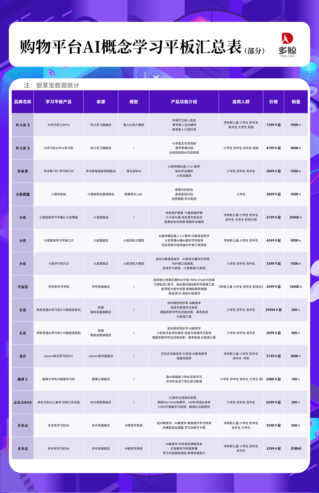 据此,多鲸梳理了当前市面上最畅销的硬件产品(以学习平板为主),详见下表。