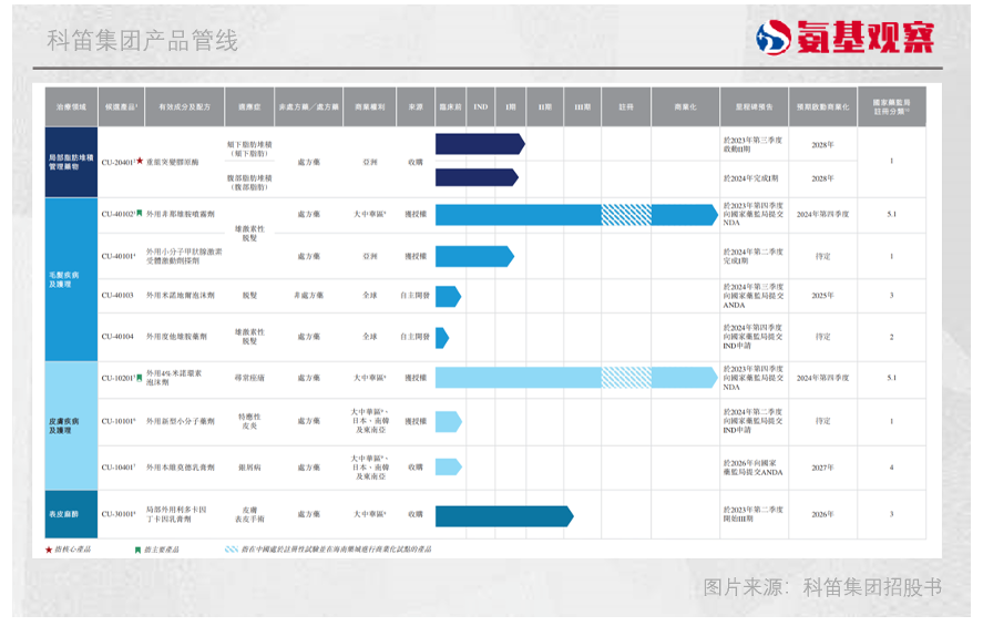 另一方面,针对银屑病、特应性皮研两大自身免疫疾病,科笛集团分别引进了靶向AhR的小分子药物CU-10401、非激素小分子药物CU-10101两款药物,不过均处于临床阶段。