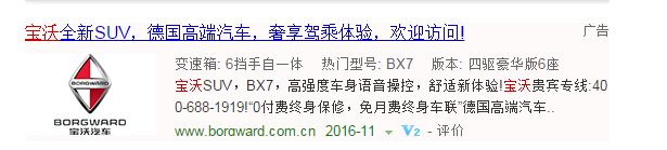 现在一打开关于宝沃的一切,比如去百度搜索宝沃,你会发现,德国宝沃出现的几率实在是太高了,比如这样的,广告里强调“德国高端汽车”
