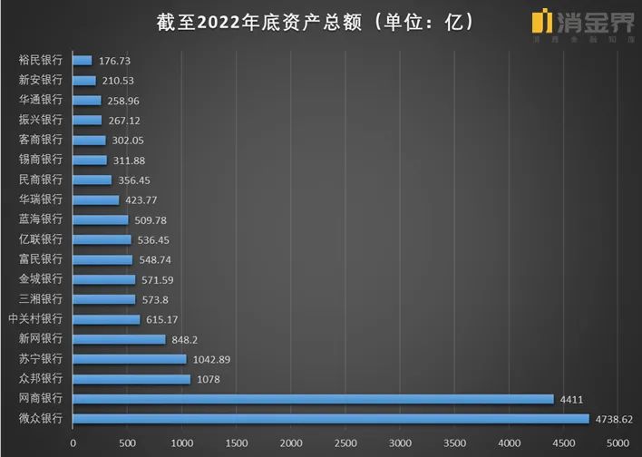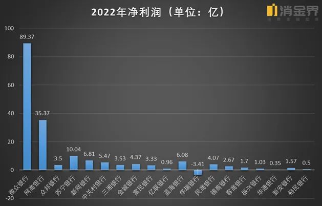 2022年,微众银行实现净利润89.37亿元,比其他18家民营银行净利润总和(87.76亿元)还要多。
