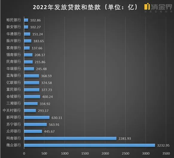 从2022年发放贷款和垫款量来看,微众银行和网商银行同样处于第一梯队——